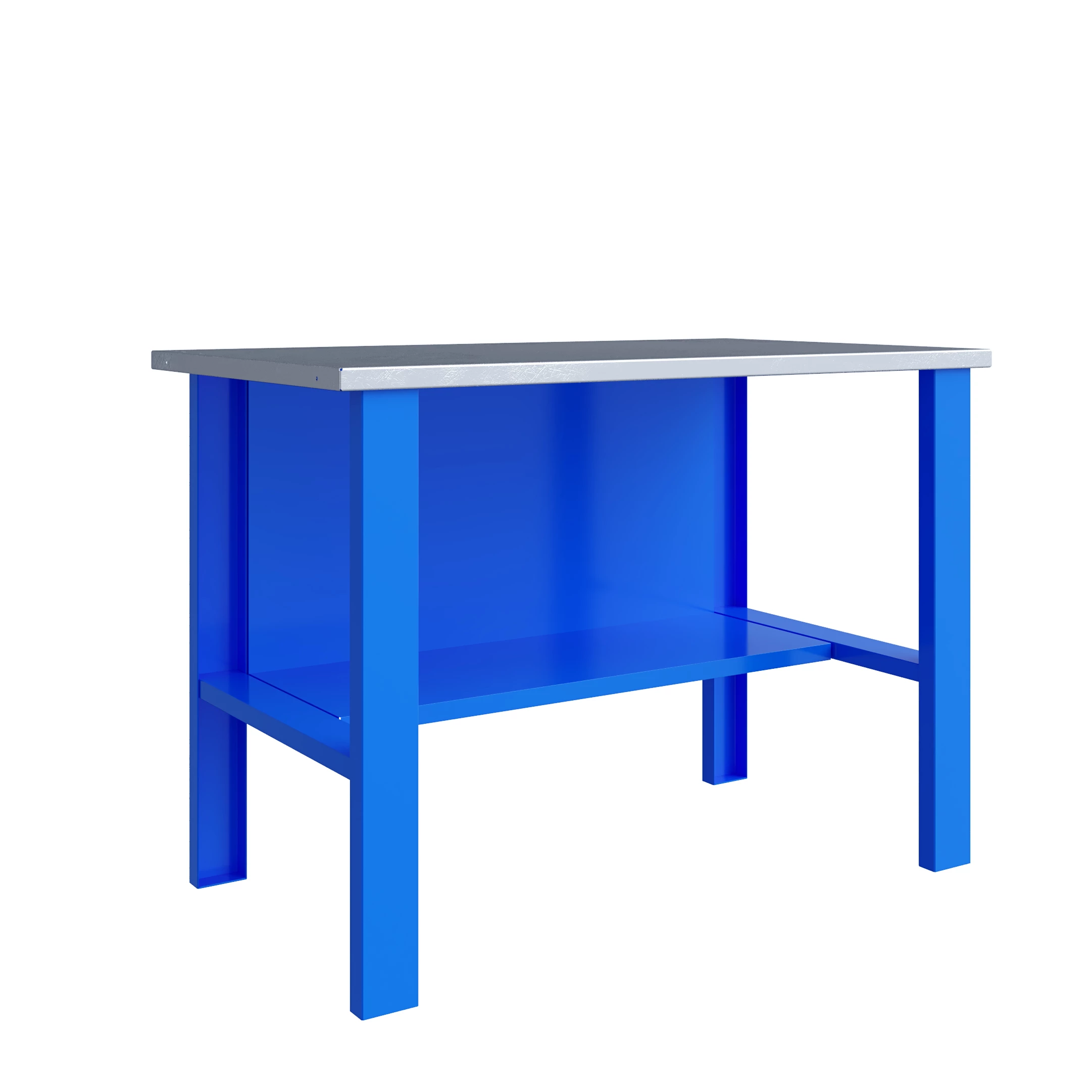 Опорные элементы выполнены сварными из холоднокатаной стали. Верстак комплектуется полкой-стенкой, расположенной под столешницей для удобного размещения габаритного инструмента и оснастки. Все металлические элементы покрыты полиэфирной порошковой краской, обеспечивающей хорошую износостойкость покрытия и невосприимчивость его к моющим средствам и смазочным веществам. Цвет и текстура покрытия корпуса тумб, опор, полки-стенки, экранов и комплектов освещения RAL 5015, гладкая, полуматовая. Цвет и текстура покрытия ящиков и дверок верстака, кронштейнов экранов и косынок RAL 7037, гладкая, глянцевая. Цвет и текстура покрытия накладок ручек ящиков и дверок RAL 9006, гладкая, глянцевая.