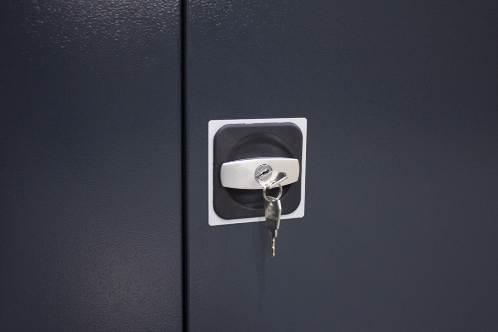 - Запирается на надежный замок с поворотной ручкой.